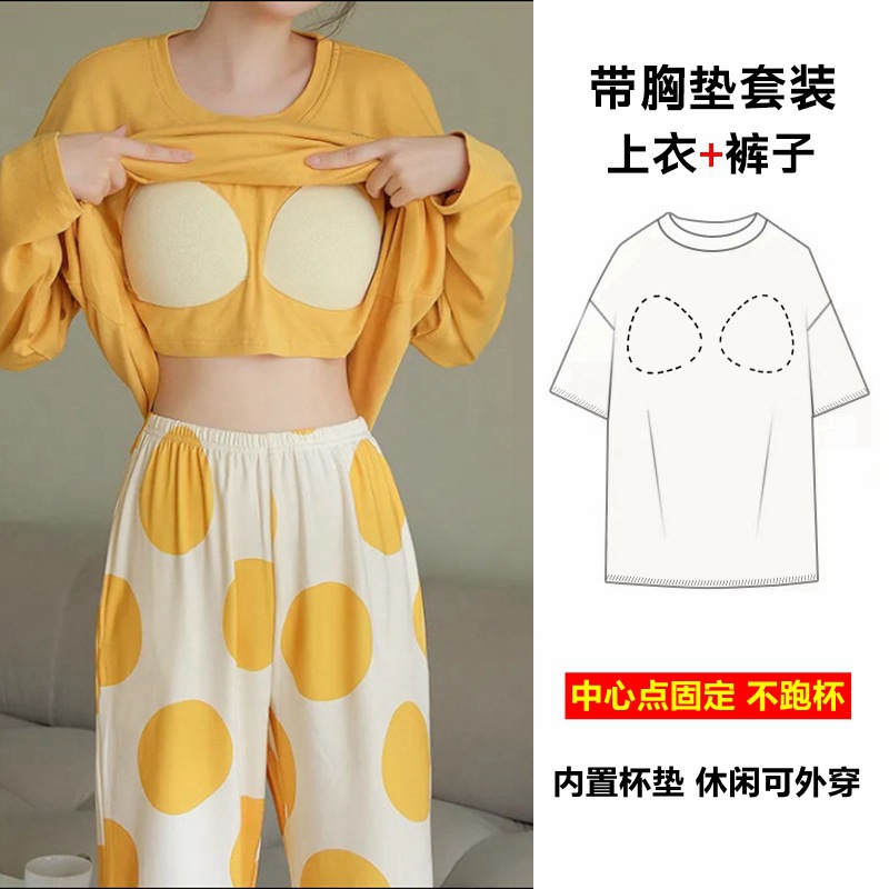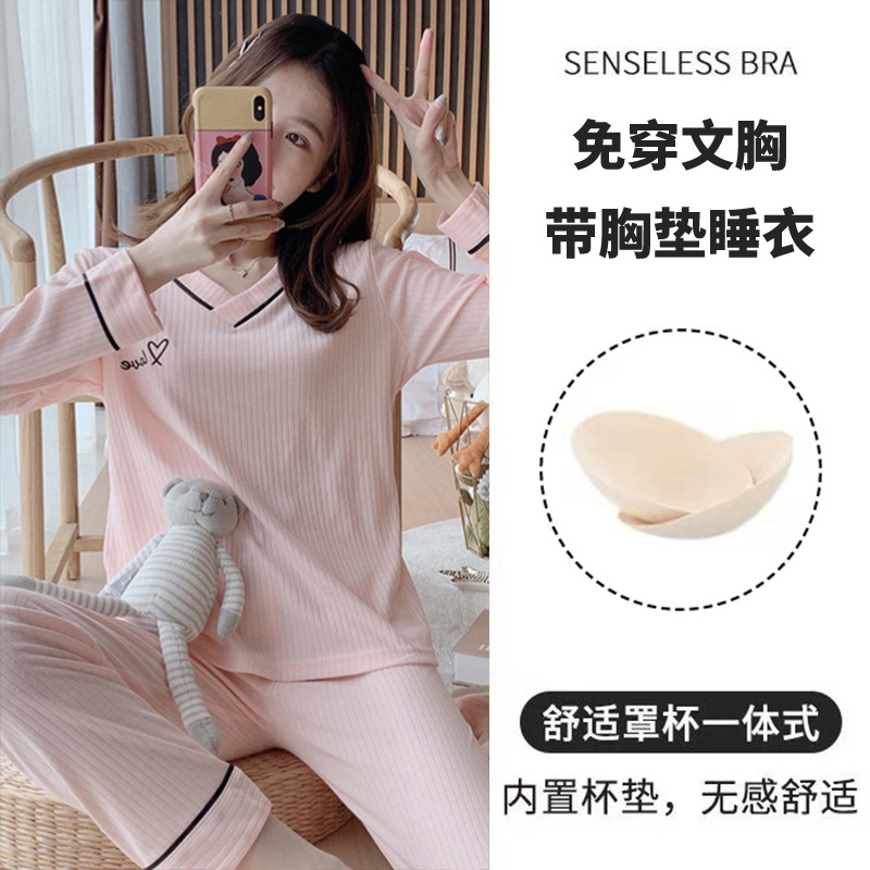 パジャマ女性の秋の長袖セットは胸パッドを持っています。
