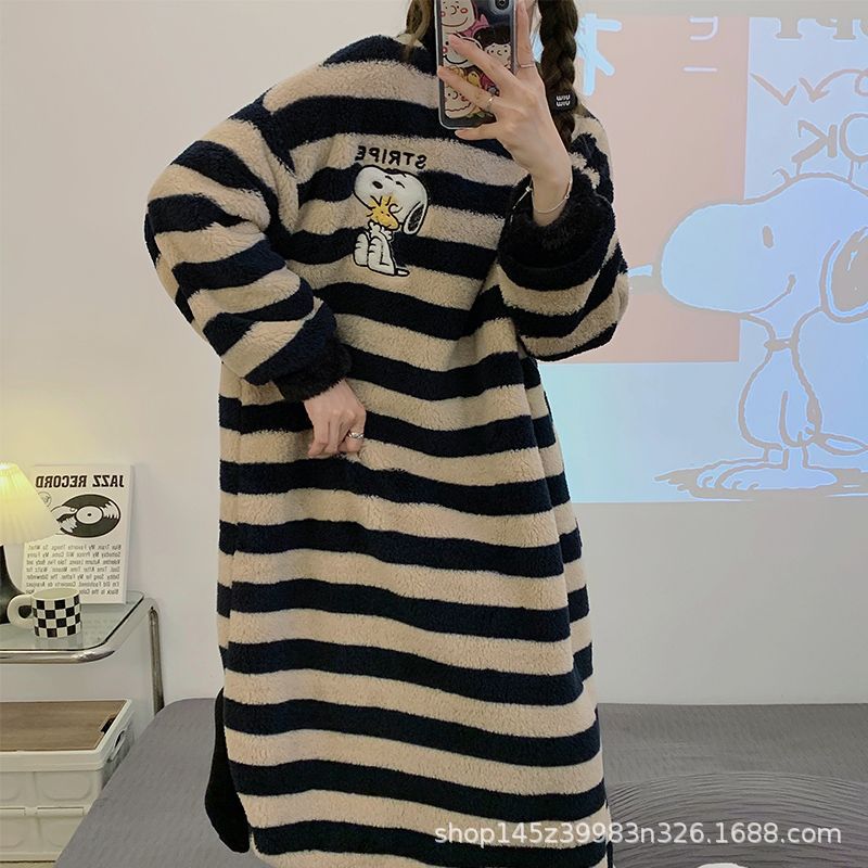 寝ているスカートの女性の秋の冬のサンゴの綿毛のストライプのパジャマの家庭服のフランネルのベルベットの厚い大きいサイズの妊婦のワンピース