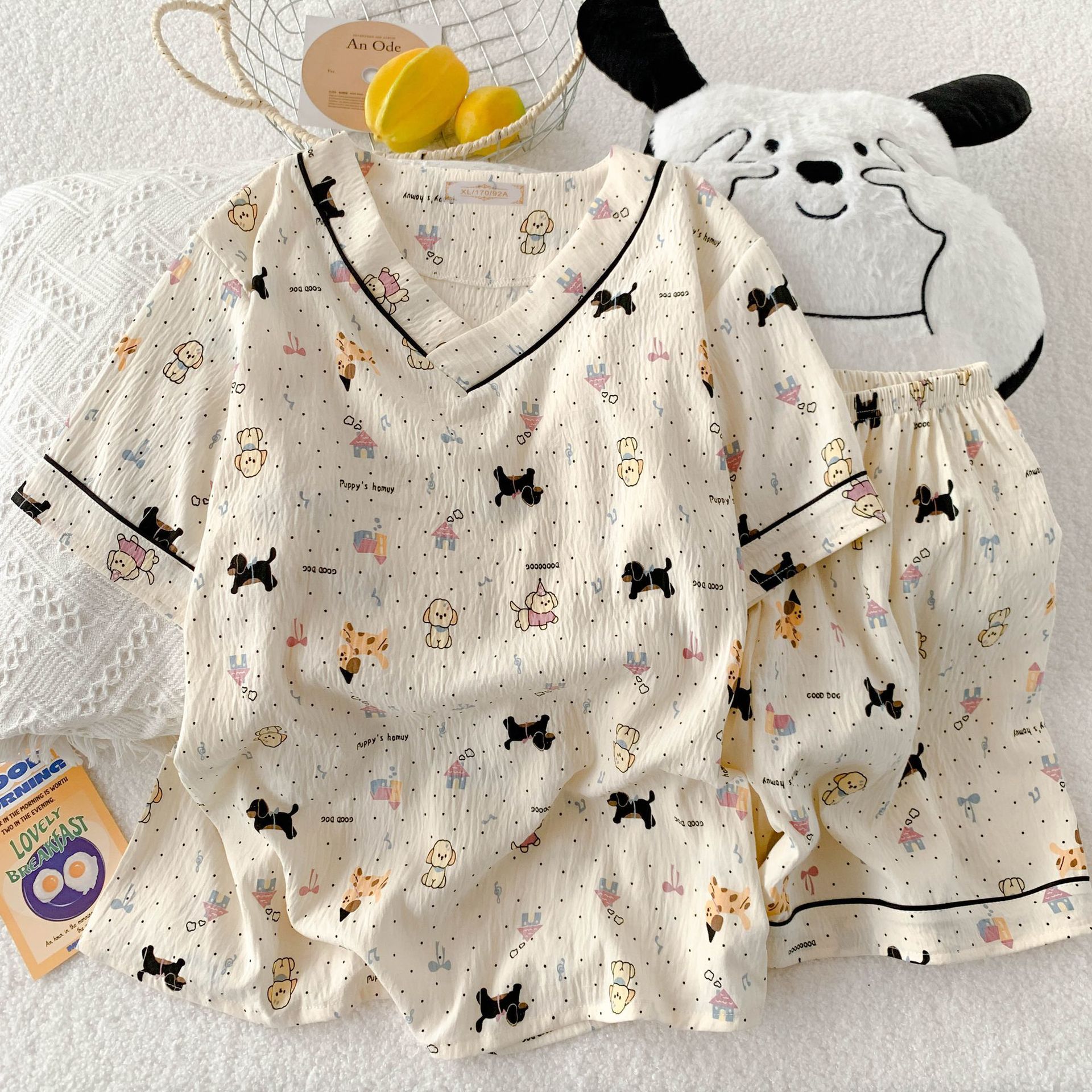 甘いパジャマ夏クラウドコットン半袖ショーツ女の子 V ネックパジャマ夏の女性はホーム服セットの外で着用できます