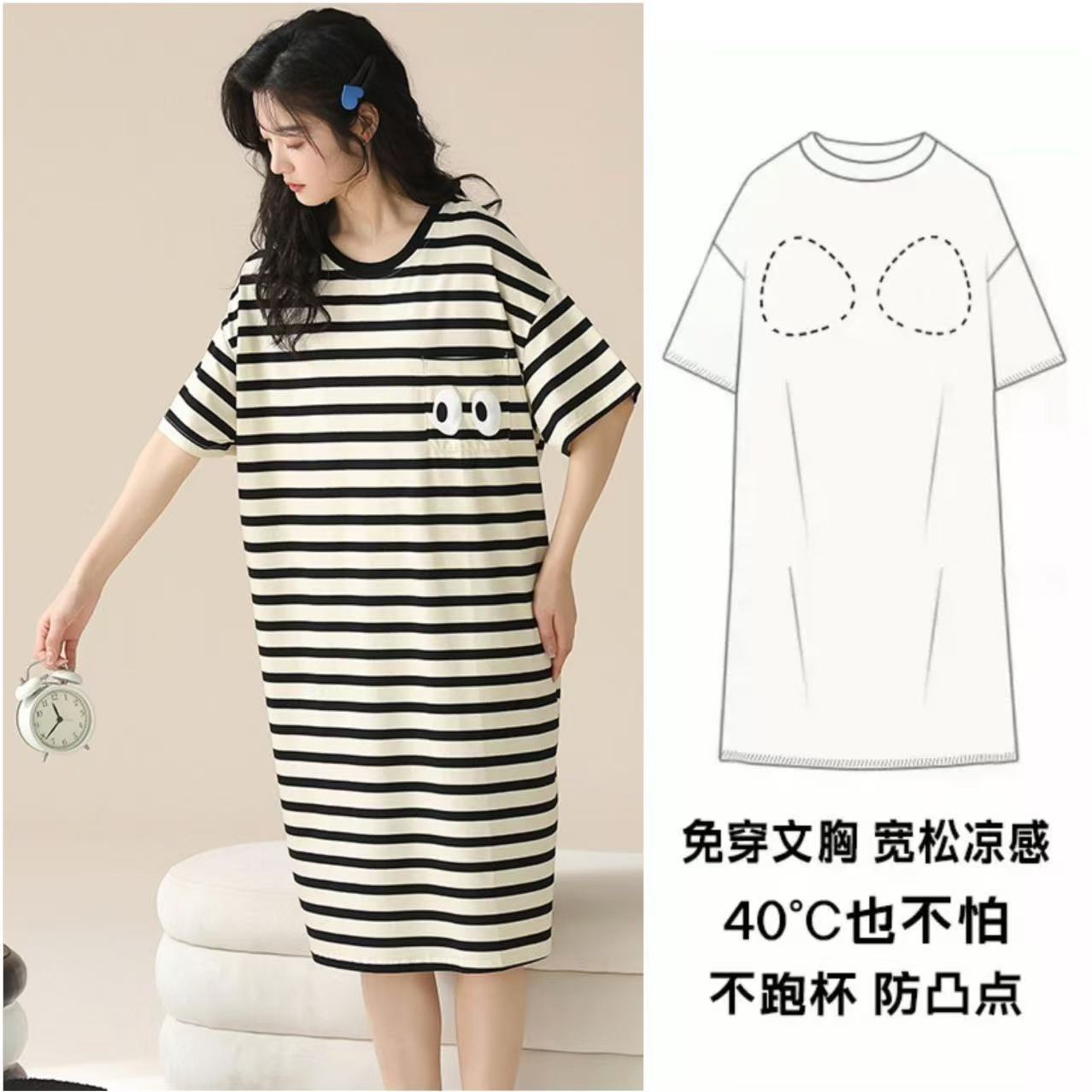 2025新型胸パッド付きの寝スカート女性タイプの夏の半袖の薄いストライプの中の長いパジャマの家の服の夏