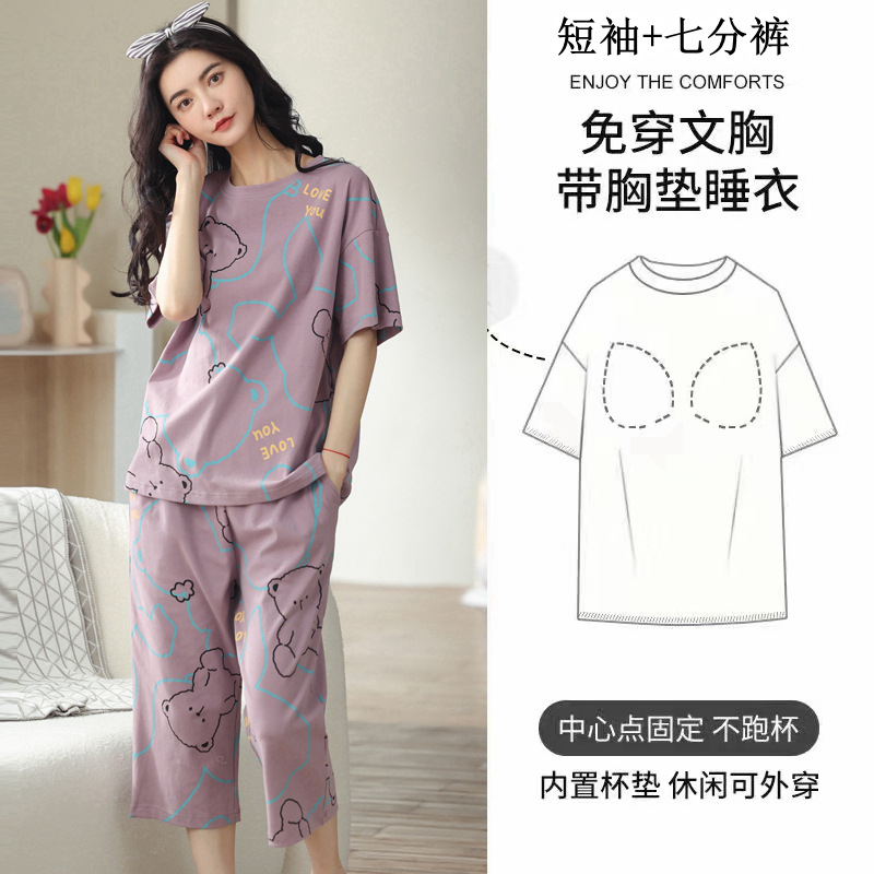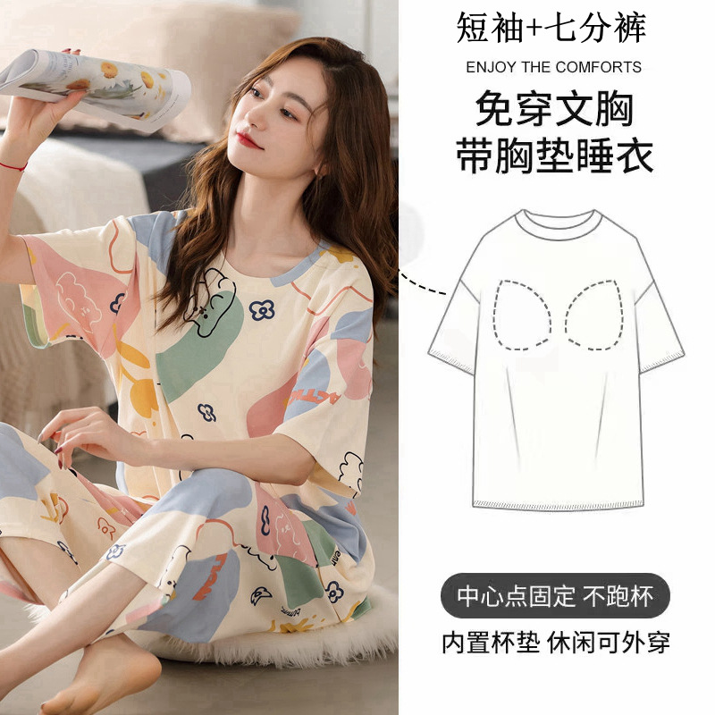 卸売りパジャマ女性夏半袖七分ズボン胸パッド付き夏の薄い韓国版はカジュアルな二点セットに出かけることができる