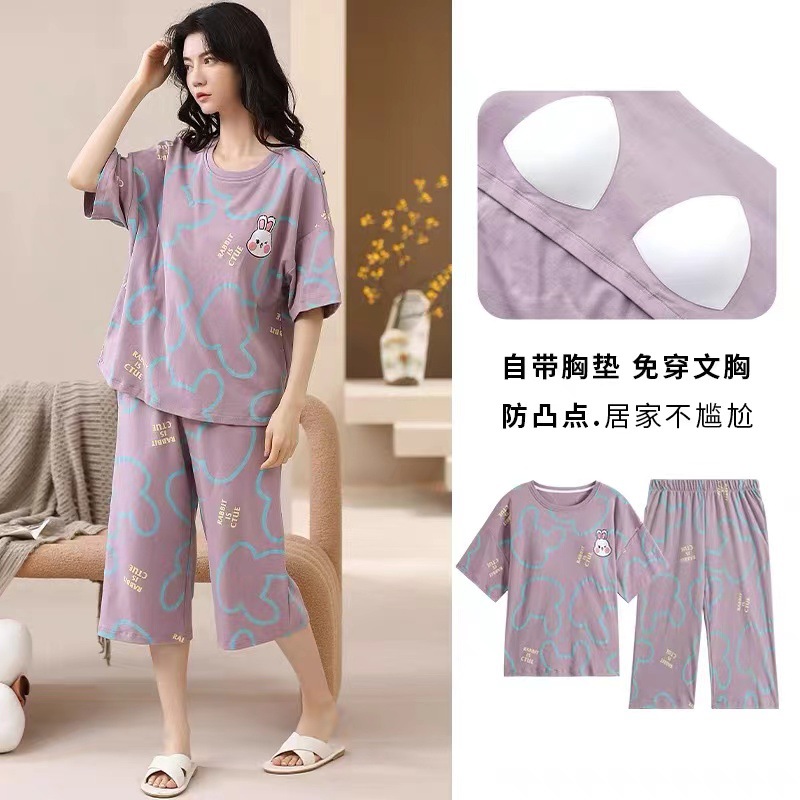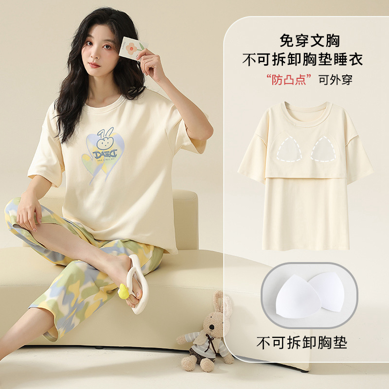 胸パッド付きパジャマ女性夏薄半袖七分ズボンカジュアルゆったり家庭服韓国版甘美二点セット丸襟