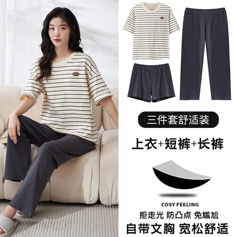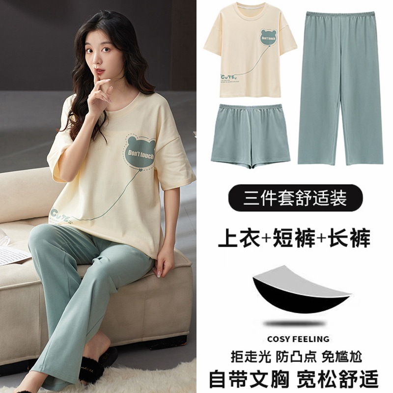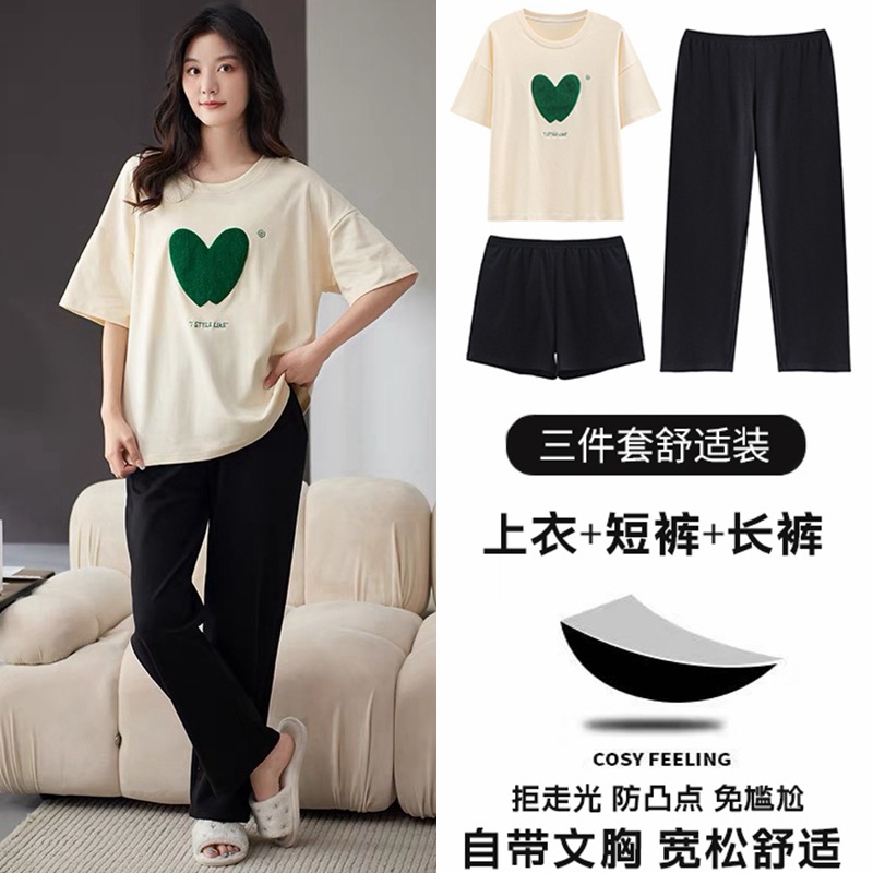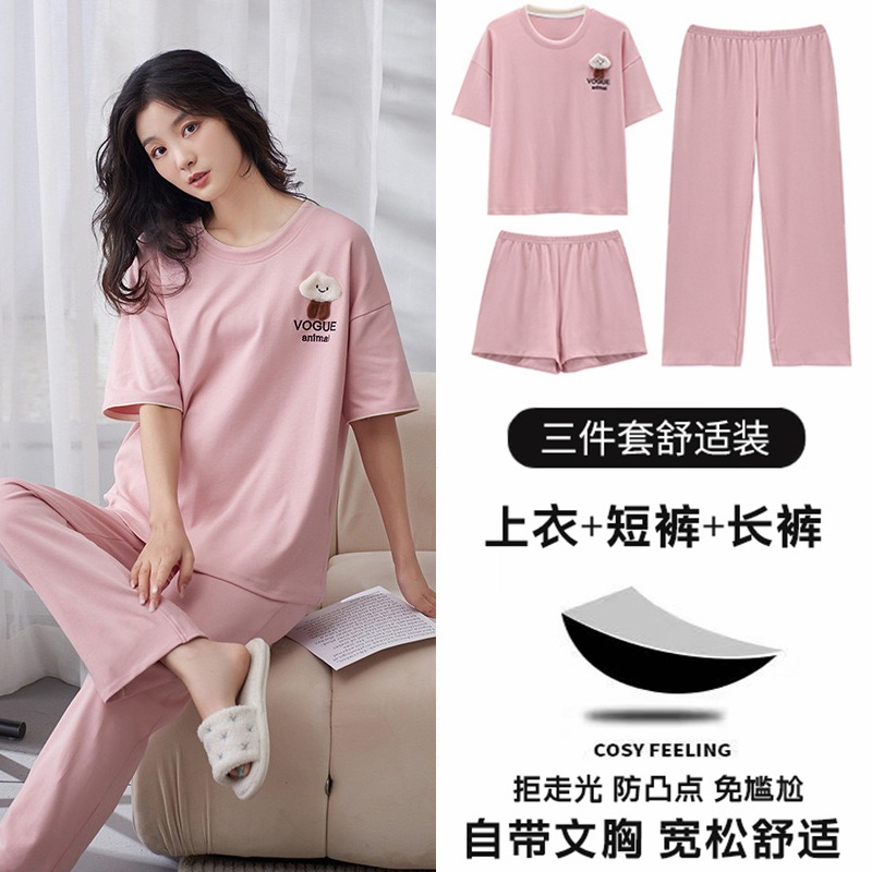【新品三点セット】半袖長ズボン + 半ズボンパジャマ女性夏のゆるい大きいサイズは胸パッド付きホームウェア