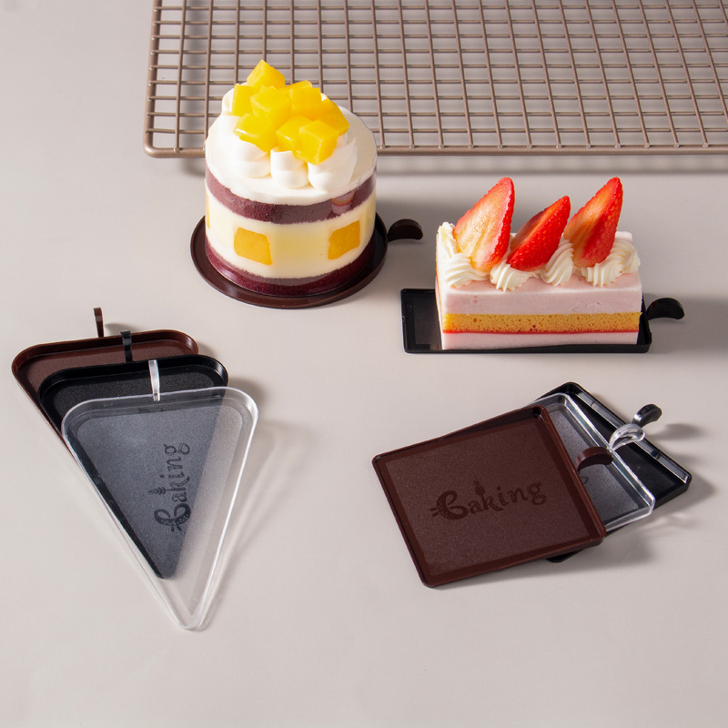 厚みのあるつや消しムースデザートトレイ、デザートベースマット、黒透明三角形カットベース、丸型、正方形、ロングストリップ
