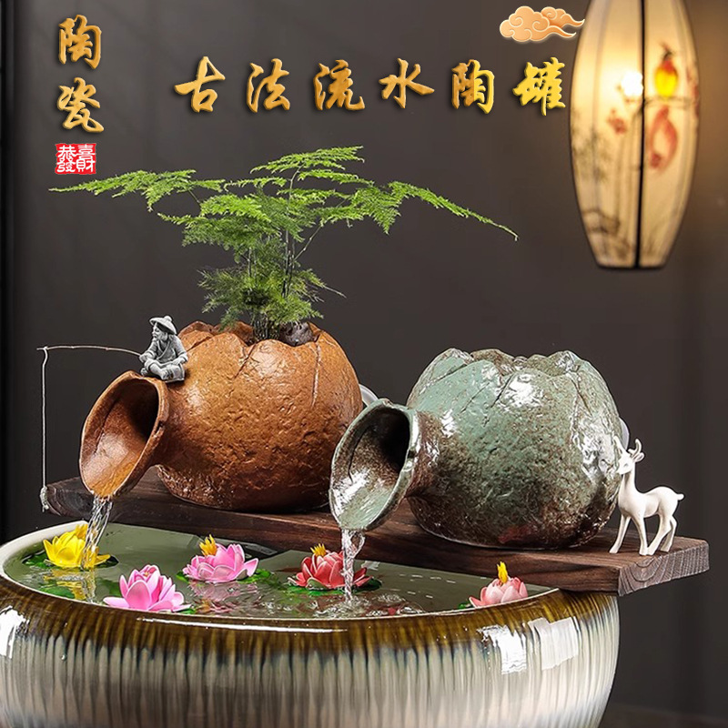 古代の魚の飼育、循環水、陶器のポットとタンクの装飾、オフィスの中庭の造園噴水、装飾品
