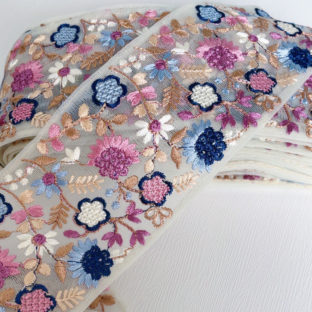群内 ~ インド刺繍リボンピンクブルー上品風生地底約7cm幅レース服装補助材料