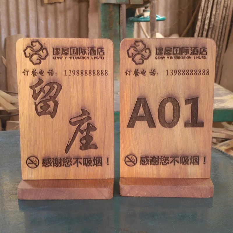 木のテーブルの札の木の切り株の縦型の両面の数字の札の台の札の2次元コードの彫刻は食事の札をスキャンします。