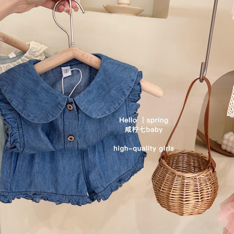 韓国の子供服2024夏服の女の子の気質のデニムのスーツの女の子の袖なしの子供服のショートパンツの2つのセット