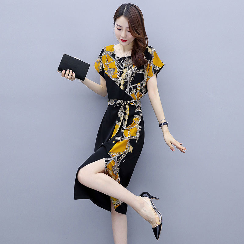 女性のためのプリントドレス 2025 夏の新しいスタイルのルーズウエスト痩身気質社交家スリットレースアップヒップスカート