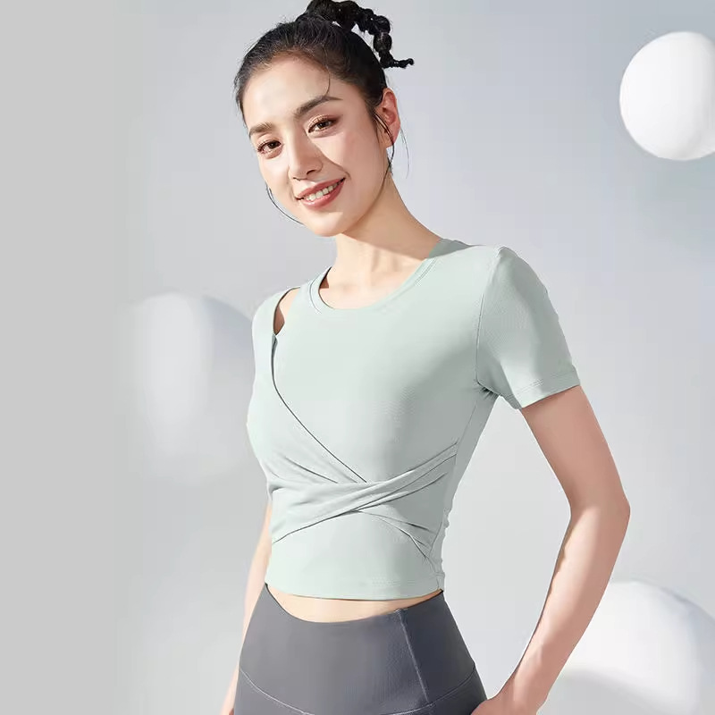 固定胸パッド付き、Douyin品質ナイロン、大きいサイズのバックレス練習着、ダンスウェア、トップス、半袖ヨガ