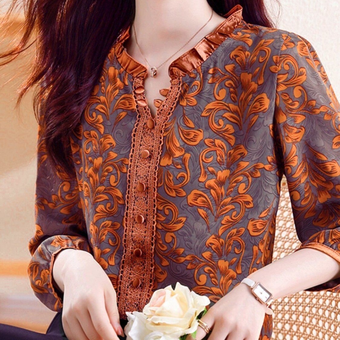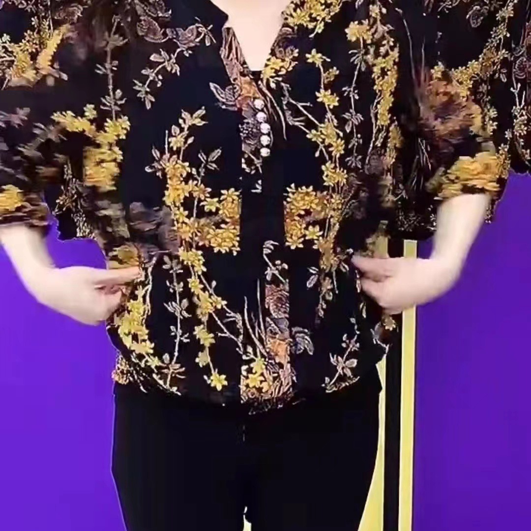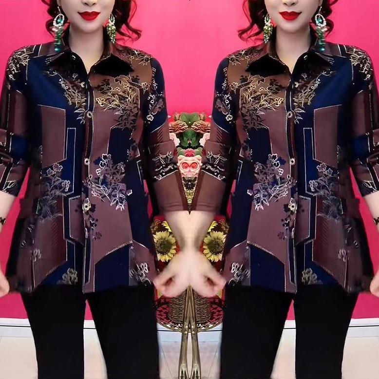 新しいシフォンシャツ、ネットセレブファッションシャツ、スタイリッシュなプリントボタン、ゆったりとした気質のマザーズトップ