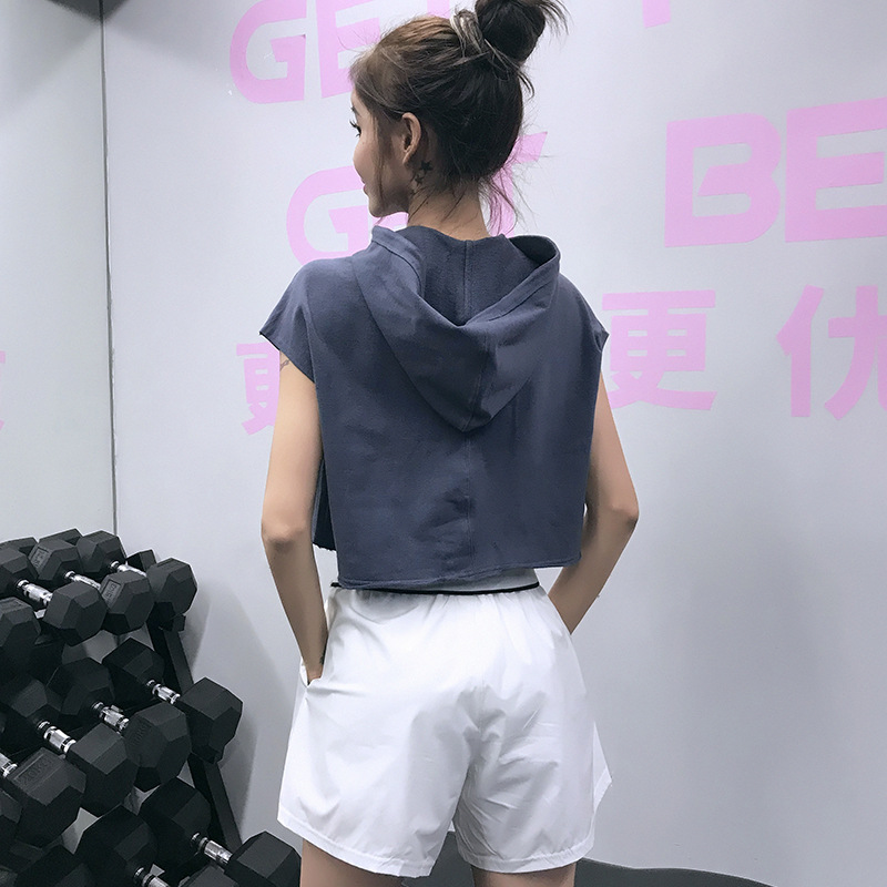 コットン大きいサイズハイウエストショート甘くてクールなフード付きトップ薄手通気性速乾ランニングフィットネススポーツウェアルーズ半袖