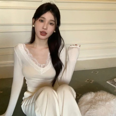 春先のレース襟長袖ボトリングシャツ女性用秋インナー弾性スリム襟プルオーバーシャツショートトップ