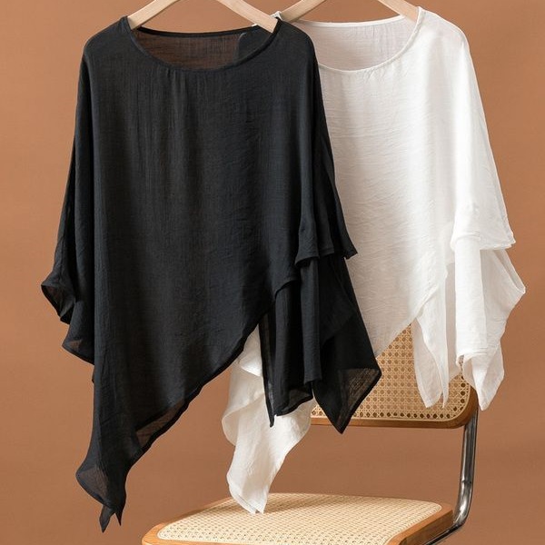 ピュアコットンスレッドコットンスパンデックス大きいサイズオフショルダーブラック半袖シャツレディースサマーボトリングシャツ斜めショルダートップ
