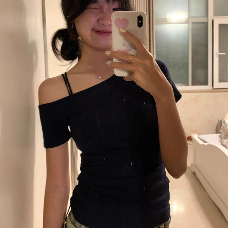 プラスサイズのレーヨン、プラスサイズのピュアディザイアスタイル、ワンショルダー、斜め肩、半袖シャツ、不規則なスリムフィット、ホットガール、オフショルダー、多用途