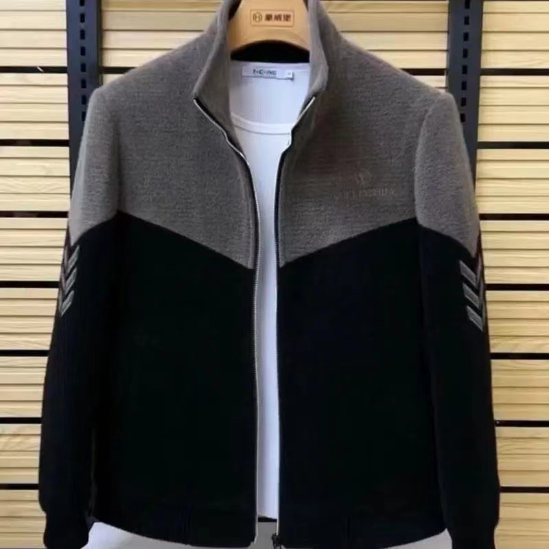 秋冬メンズカラーブロックファッションジャケットスタンドカラーステッチカジュアル厚く暖かい大きいサイズトップトレンディ