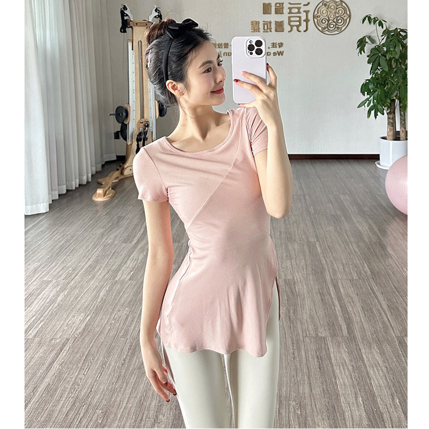 レーヨンプラスサイズスリムフィットスリットスポーツトップヨガウェアカバー肉痩身カジュアルランニングフィットネス半袖シャツ