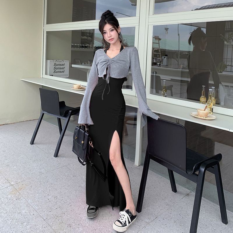 ネットセレブと同じスタイルのホットガールピュアディザイアスタイル長袖プリーツトップ+ホルターネックウエストフィッシュテールヒップカバードレススーツ女性用