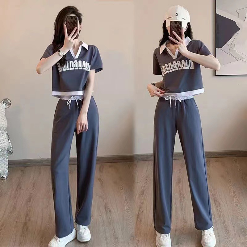 新しい韓国スタイルの年齢軽減スポーツカジュアル半袖ワイドレッグパンツの女性用プラスサイズのツーピースセットの夏服