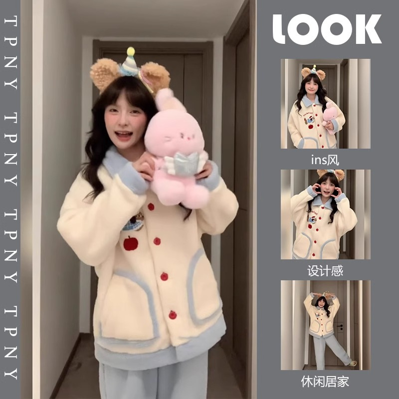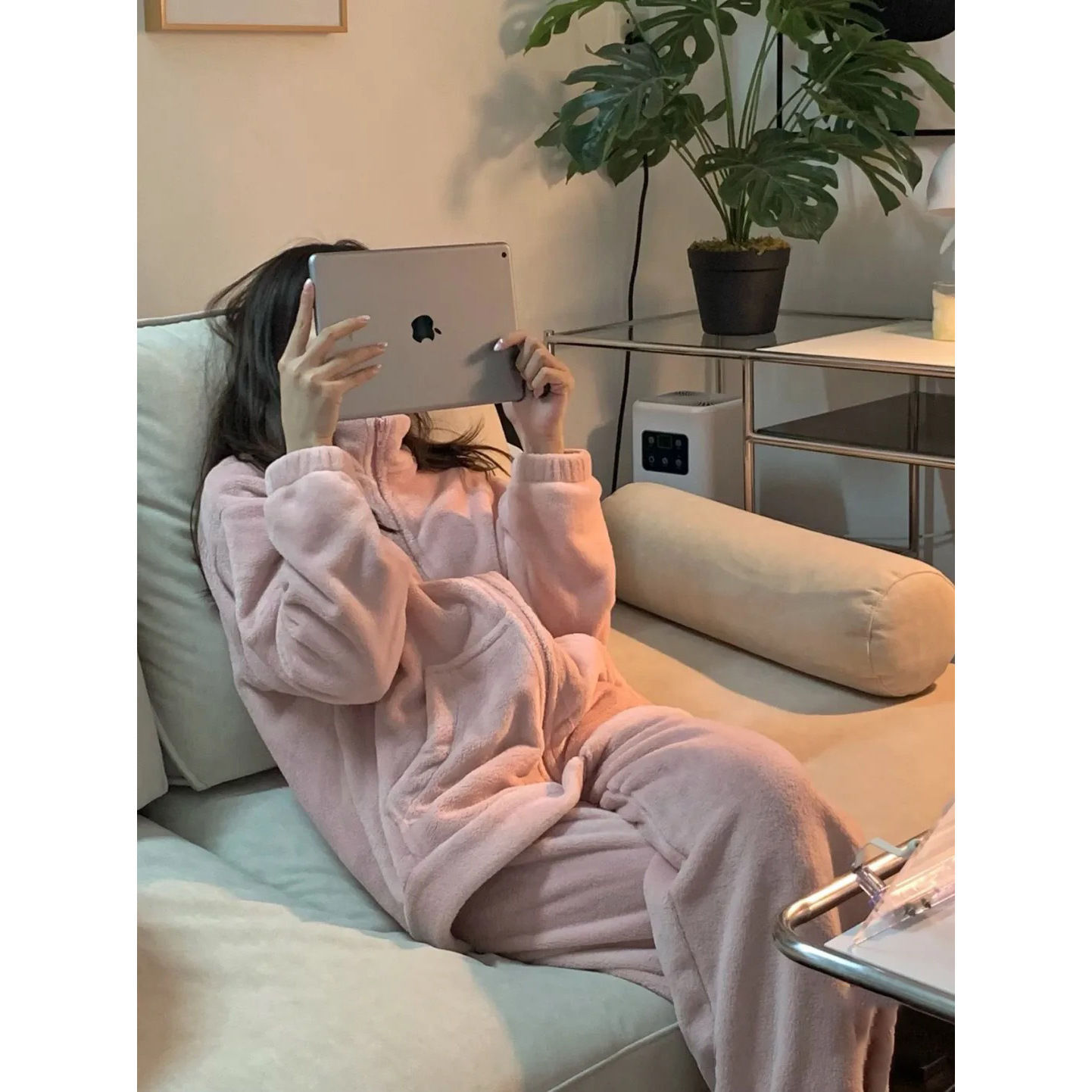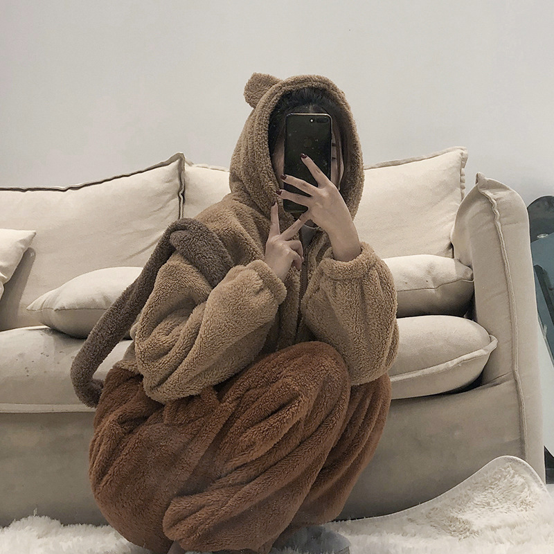 かわいい蜂熊連帽サンゴのベルベットの寝衣女冬2024新型ルームウェアのパジャマとベルベットの厚いセット