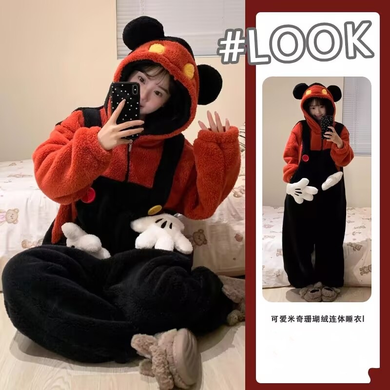 かわいいアニメのミッキーの帽子のサンゴのフリースのワンピースのパジャマの女性のタイプの冬の2025年の保温の一体式の家庭服