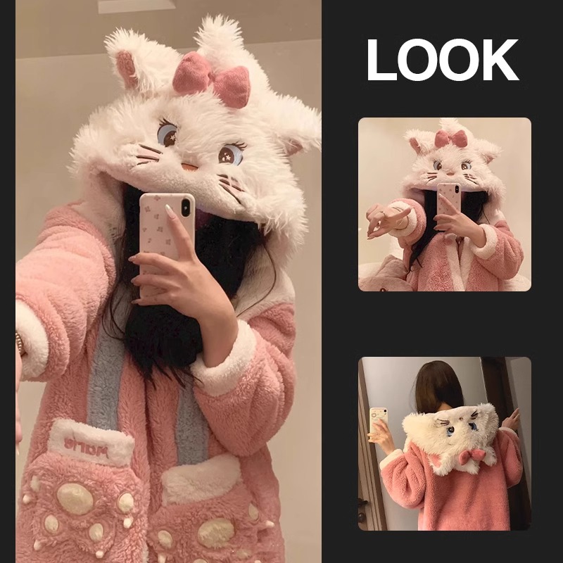 かわいいメアリー猫フード付きコーラルフリースのパジャマ女性冬2023新型ルームウェアのパジャマとベルベットの厚いパジャマ