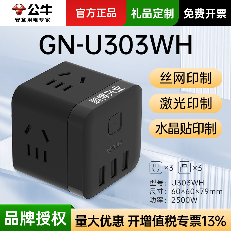 【U303wh】雄牛テッセラクトコンセント黒総制御無線3ソケットusb多機能クリエイティブロゴプレゼント