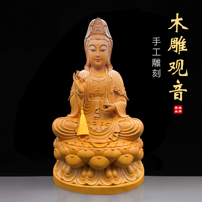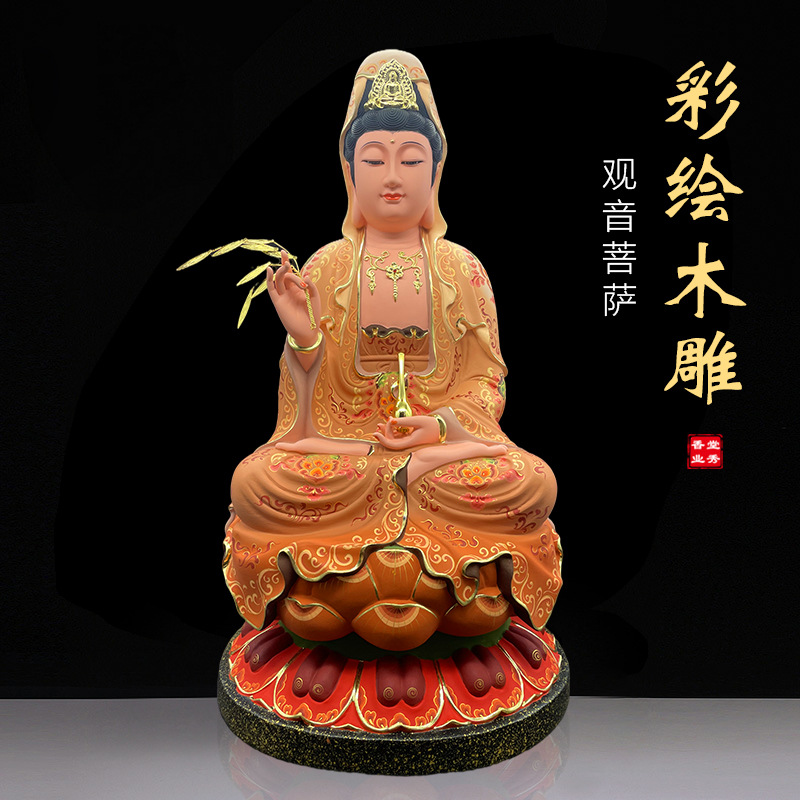 香樟実木雕観音仏像彩色家庭用奉供坐莲観世音菩萨婆三聖置物精雕