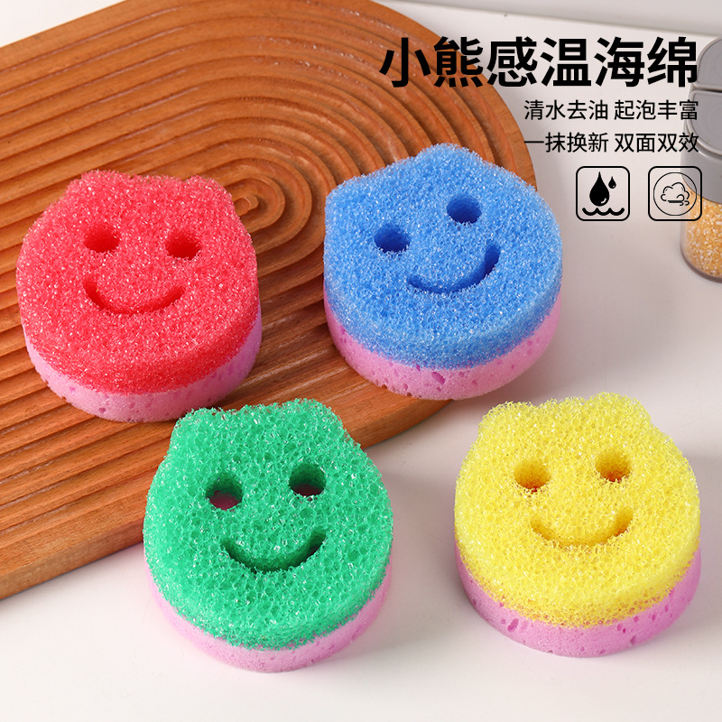 かわいいクマの温度感知スポンジ家庭用クリーニング食器洗いスマイリーフェイススポンジ洗浄ノンスティックオイル温度感知スポンジ卸売