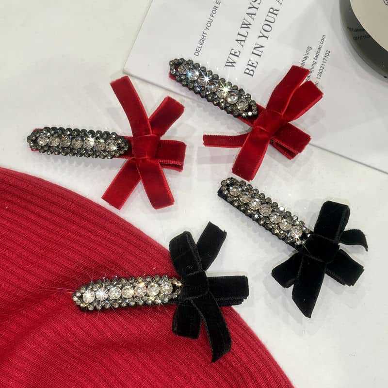 高級感の軽い贅沢なワインの赤いベルベットの蝶結びの灰色のドリルのアヒルの口は甘美な気質の髪を挟んで前髪を挟みます。