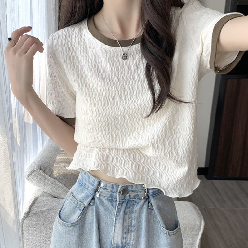 フランスの木の耳元の半袖のtシャツの女性の夏のゆったりした薄いタイプのシフォンの清純で甘い上着の独特な短いタイプの半袖