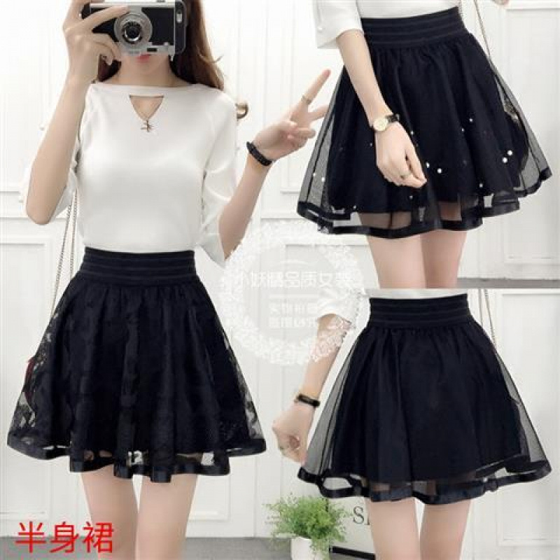 2025夏の新型レースのスカートの女性ネットのスカートの半身のスカートのA字の傘のスカートのズボンのスカートの高い腰の黒色の蓬蓬のスカート