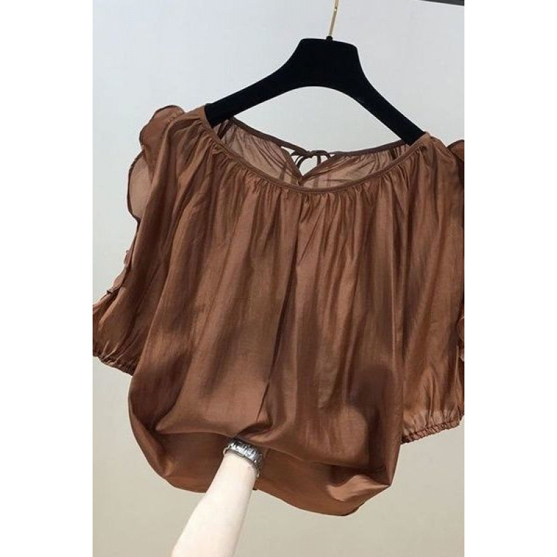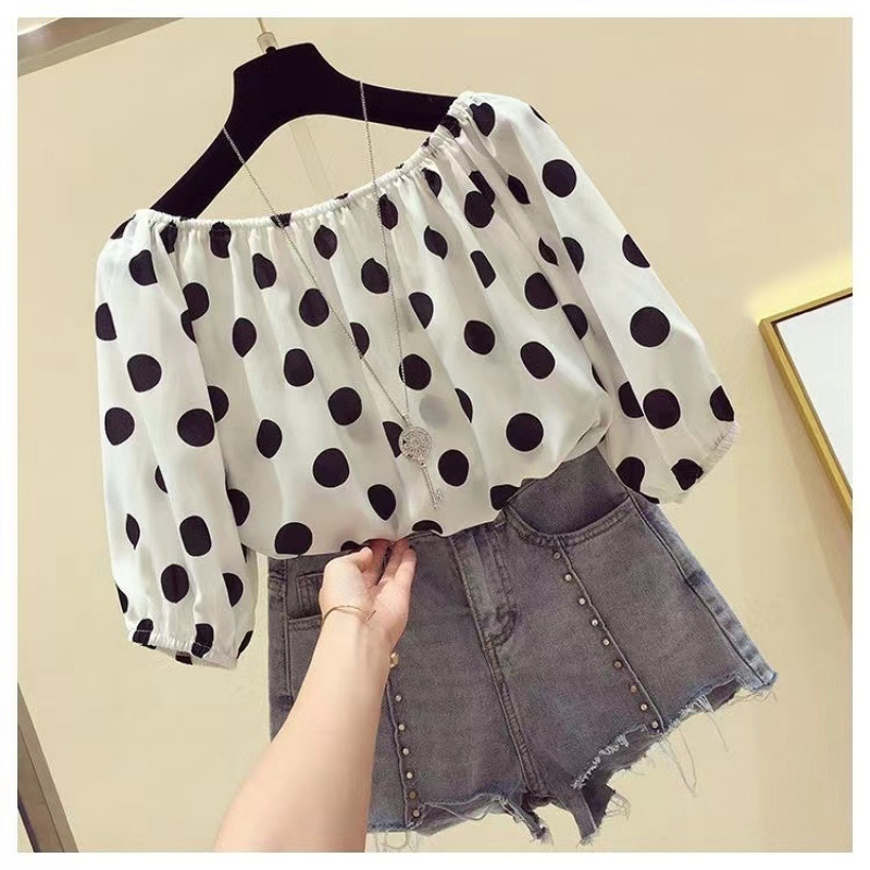 シフォンのシャツの半袖の夏の新型の韓国版のゆったりした気質の洋風の波は1字の肩の上着の2灯籠の袖の上着をつけます。