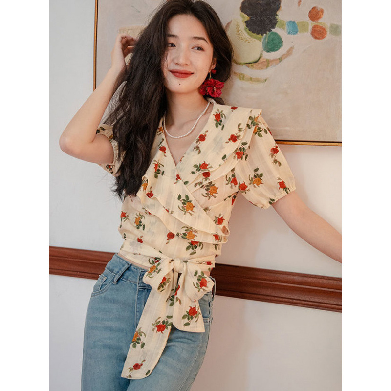 大きいサイズのフランス式の独特な小衆の花の上着の女性の夏は腰を収めて半袖のシフォンのシャツの短い香港風を縛ります。