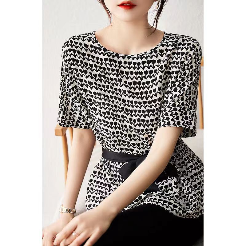 水墨プリントvネックシフォンシャツ女性半袖2025新型夏フレンチレトロゆるいデザイン感上着潮