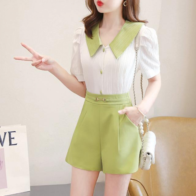 夏の新型は背が低くて清新で甘い半袖のシャツの襟のシフォンのシャツの広い足の半ズボンの2つのセットです。