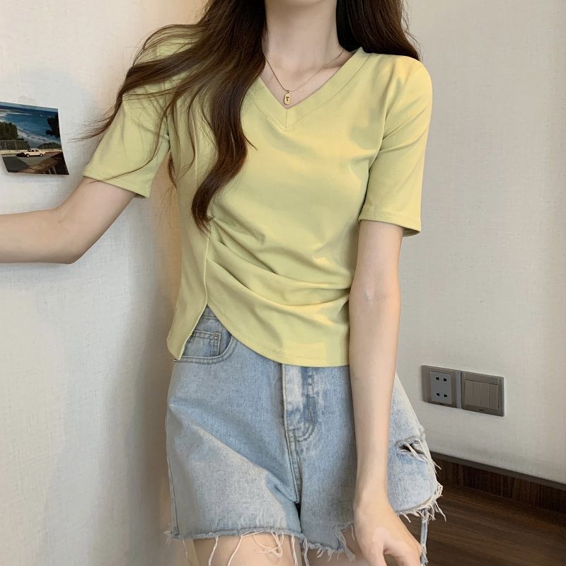 純綿の不規則なvネックの上着の女性の夏の雰囲気はやせています。