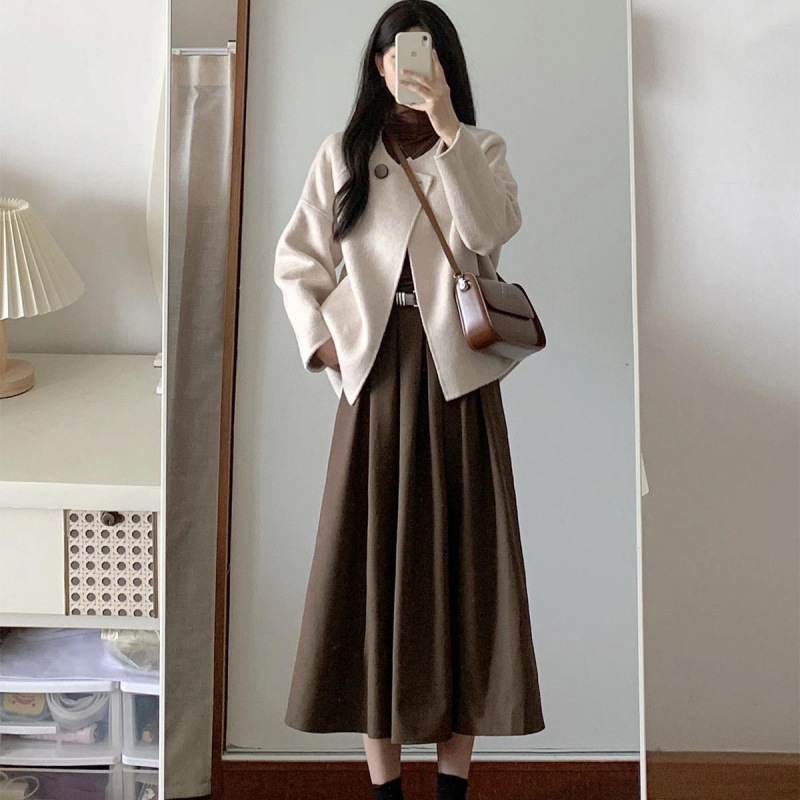 春の服の女性はセットの気質のマントの毛を組み合わせます。コートの半身のスカートの高級感の塩系は2つのセットを着ます。