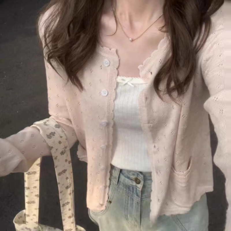 夏の薄いタイプの小さい香りの風のchi韓系の純色の優しい風の透かし彫りのニットの上着の女性の外は日焼け止めのコートを掛けます。