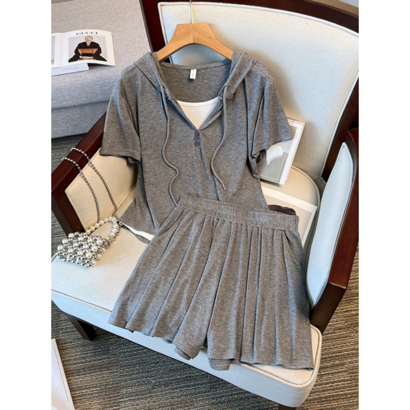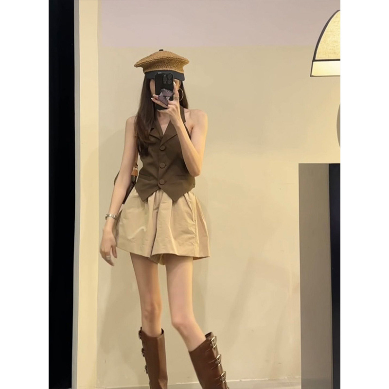 韓国chic2025夏のフランス風の気質の方襟の単列は馬甲の高い腰の広い足のカジュアルな半ズボンのスーツを掛けます。