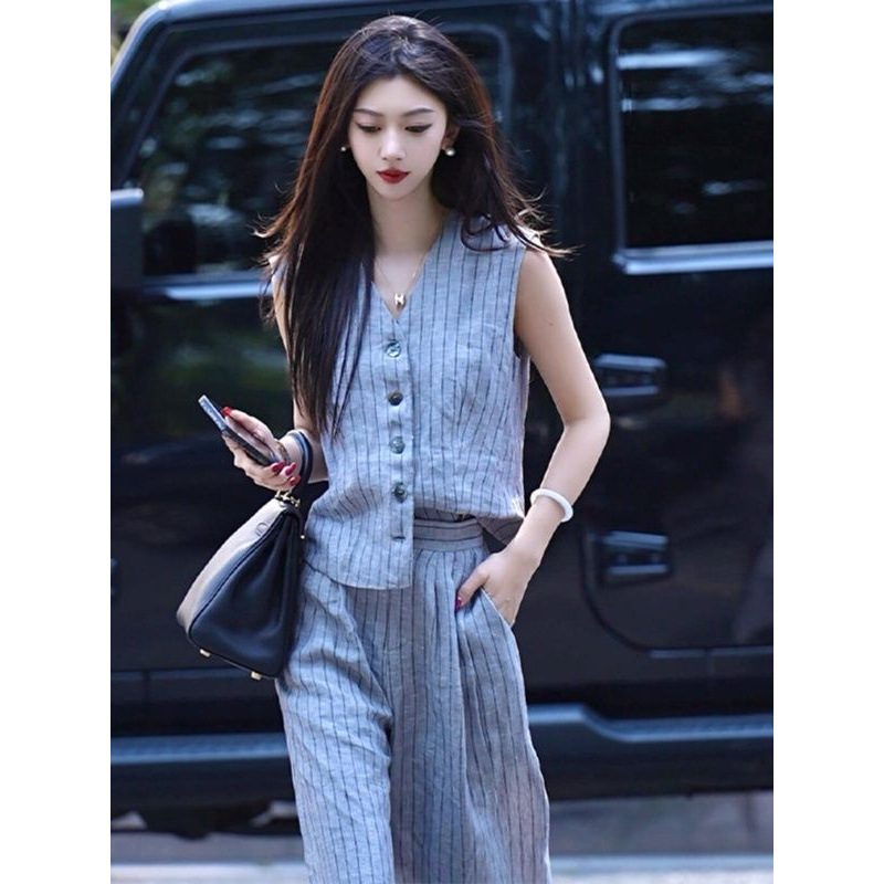 2025年夏の新型韓国版高級感気質スーツ馬甲広腿ズボン2点セット女性ファッション洋気