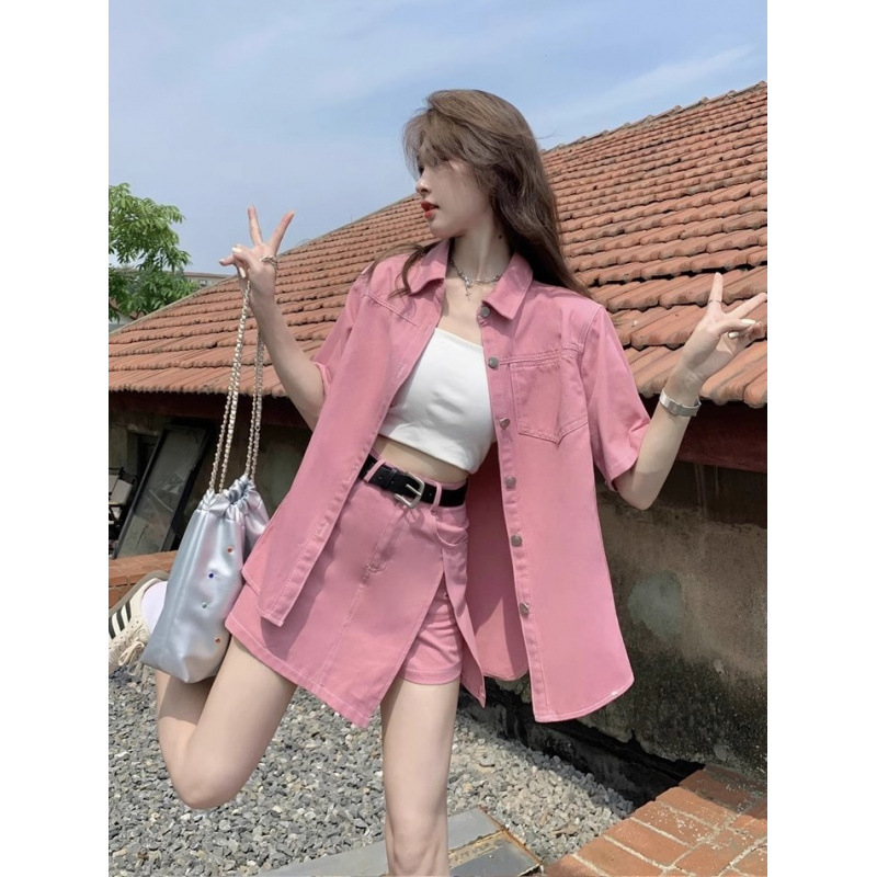 ドーパミンのカジュアルなピンクのデニムのスーツはゆったりしています。