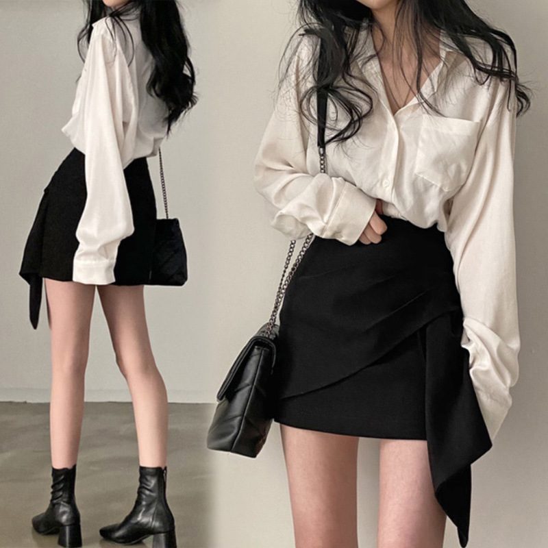 怠惰な風がシンプルでカジュアルな白い長袖シャツ2025夏の新型ファッションは不規則なスカートセットになっている