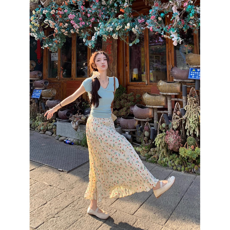 夏の新型韓国版の甘くて優しい風の泡の袖の波の点の上着の女性のハイウエストはやせているa字のスカートのスーツを現します。