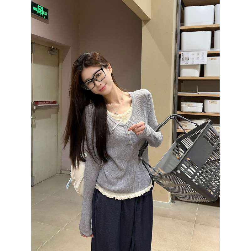 小香風偽二枚の正肩長袖tシャツ女装秋の小柄なデザイン感があります。