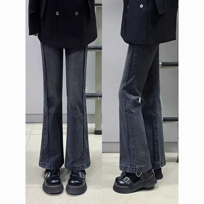 黒とグレーのマイクロフレアジーンズ、女性用、春秋、裏起毛、大きいサイズ、ぽっちゃりさん向け、ハイウエスト、ヒップカバー、デザイン性のある伸縮性のあるフレアパンツ