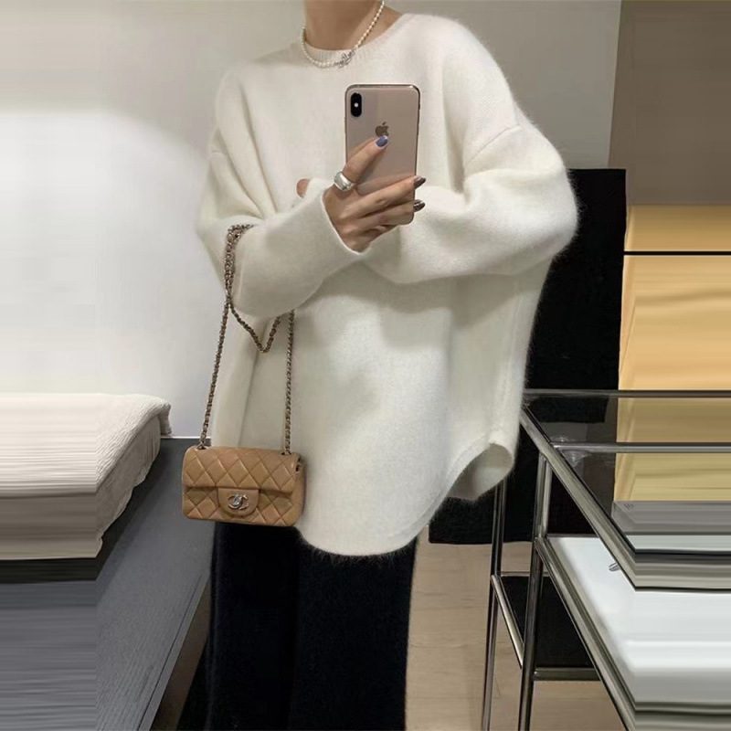 ミディアムセーターの女性が爆発した秋の冬の優しさは怠惰な風の高級感があります。