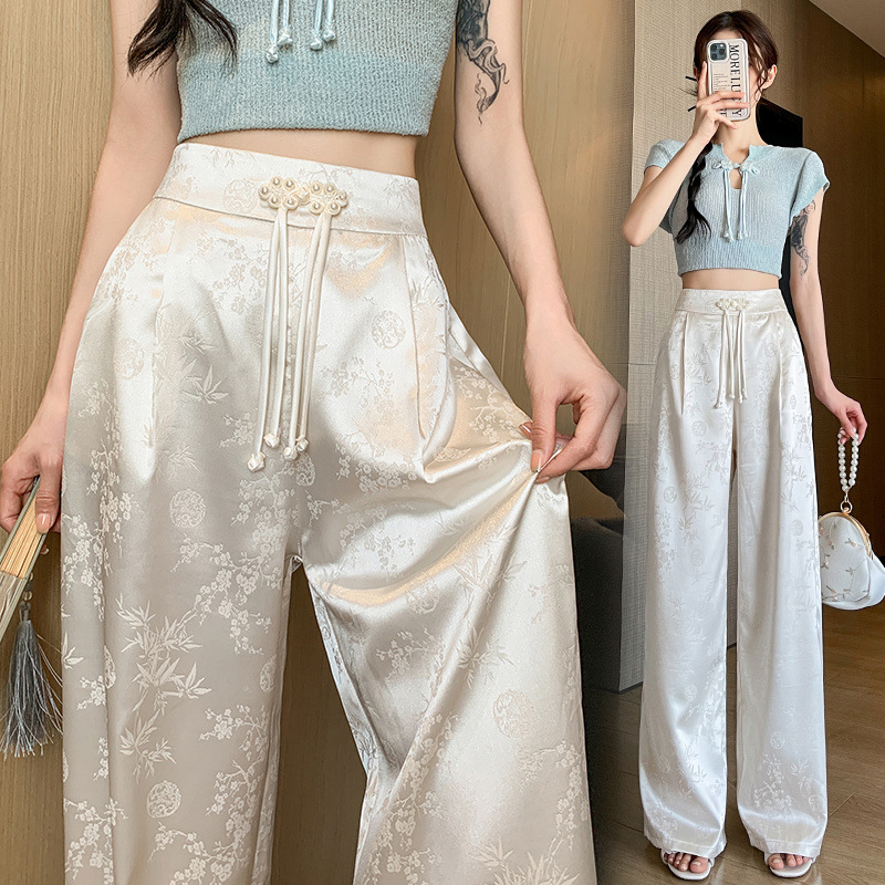 国風はサテンのジャカードのワイドパンツの女性2025の新型のデザイン感をまねています。