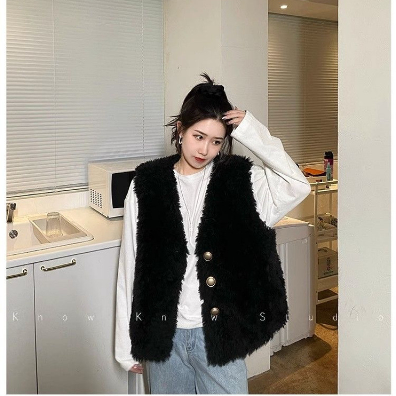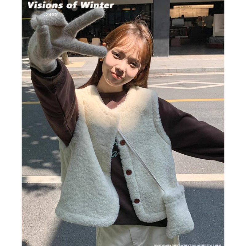 子羊の毛馬甲の女性の短いタイプの秋冬の新型の柔らかいモチモチのファッションの外はボタンのデザイン感の袖なしの上着のファッションのタイプを掛けます。