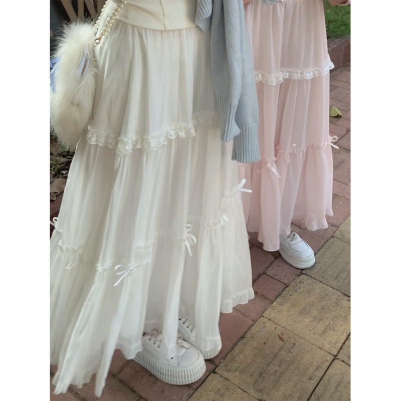 和風の甘い雰囲気の女の子らしいリボン付きハイウエストスリムな大きな裾のスカート、妖精のようなロングスカート、春秋の新作
